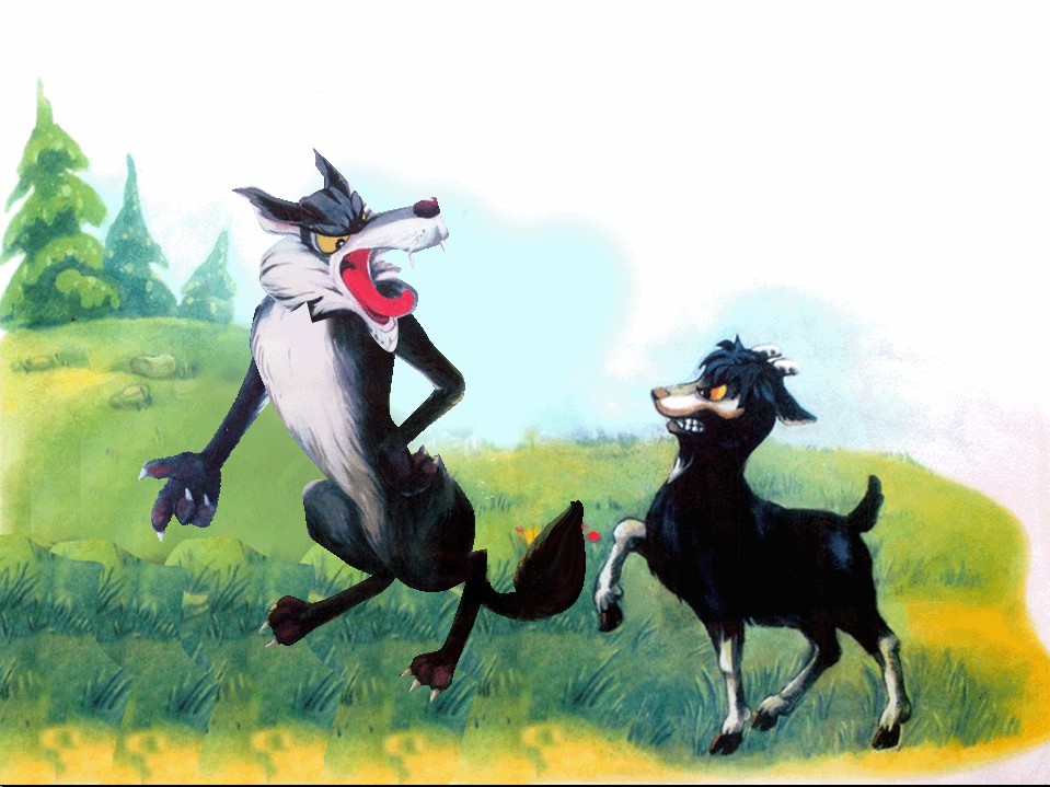 Dê đen cũng đi tới khu rừng để ăn cỏ non và uống nước suối. Đang tha thẩn ngặm cỏ, chợt Sói xuất hiện, nó quát hỏi: