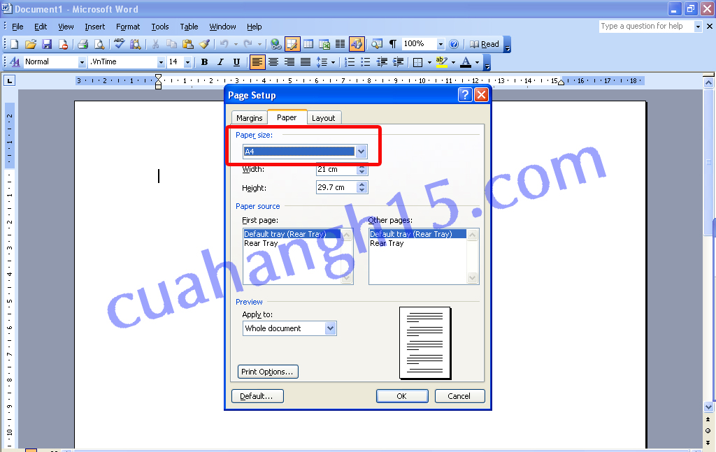 - Vào tab Paper, trong mục Paper size, chọn khổ giấy A4 như hình dưới