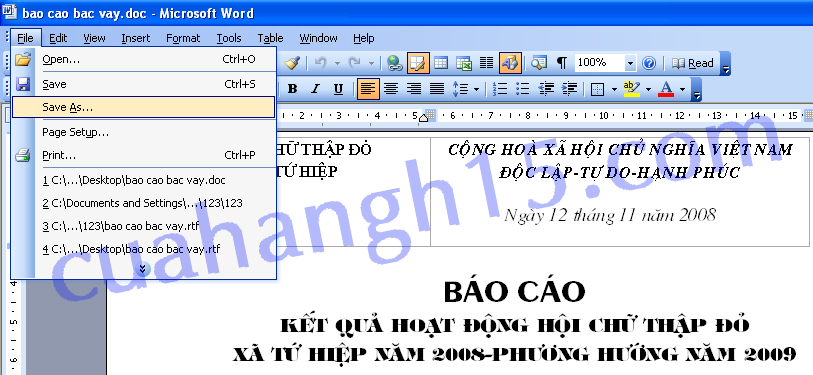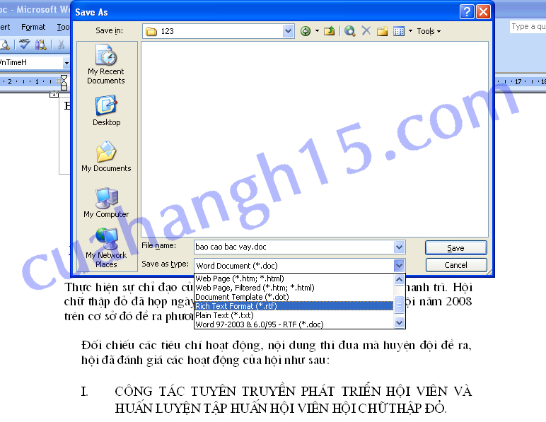 + Chọn File > Save As , chọn phần mở rộng là Rich Text Format để lưu lại với định dạng +.rtf